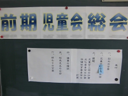 9月4日(金),前期児童会総会を行いました。三役・文化委員会・保健体育委員会の代表が,それぞれ前期の活動について,成果と課題を述べました。子どもたちは,自分たちで考えた新たな取組を,協力し合いながら進めてきました。挨拶運動の工夫や,友達のよいところを発見し合う取組等,後期も新たな企画にチャレンジしていく子どもたちです。