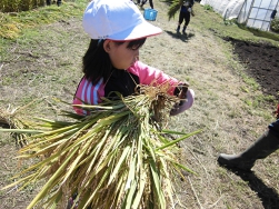 9月16日(水)は,無事に今年度の稲刈りを終えることができました。長寿会の皆様にご指導をいただきながら,子どもたちは鎌の使い方や,刈った稲のしばり方などを覚えることができました。特に高学年は,田植えの後,毎朝の観察や草取り,防鳥網の設置など,「自分たちの稲」という意識をもって頑張ってきました。子どもたちの表情はどの子も晴れやかで,収穫の喜びを感じていたようです。これまでご支援・ご協力をいただいた皆様に,心より感謝申し上げます。12/11(金)にとれたもち米を使って「もちつき集会」を行いますので,是非ご来校ください。