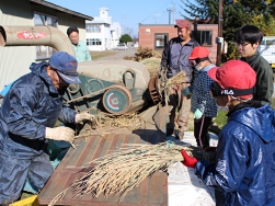 10月16日(金)に,稲の脱穀作業を全校で行いました。今年度は,地域の方から1964年製の「全自動脱穀機」と「発動機」をいただき,新たに稲作の歴史を学びながら体験学習を展開することができました。稲の先生方やPTA役員の方々にご支援をいただき,50年の眠りから目覚めた機械で,高学年中心に脱穀を体験することができました。また,例年のように「足踏み脱穀機」や「唐箕(とうみ)」も使い,伝統の脱穀を体験しました。これから精米作業を行い,12/11(金)に予定している「もちつき集会」に備えます。