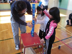 11月29日(日)に,PTA体育部が中心になり,親子ミニ運動会が行われました。紅白の2組にわかれ,4種目で競い合いました。「巨大オセロ」「だるまリレー」「空き缶積み」「キャッチ ザ フラワー」と趣向を凝らした種目が展開され,子どもも,大人も,大いに笑い,あっという間に楽しい1時間半が過ぎました。勝っても負けても楽しさが込み上げてきて,子どもたちもお父さん・お母さん方もニコニコ顔でした。このミニ運動会は,親子の絆を大切にする取組として,今後も続けて行きたいと思います。