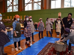 今年度も12月11日(金)に「もちつき集会」を無事開催することができました。保護者の皆様に支えていただきながら様々な行事を進めてまいりましたが,「もちつき集会」は特に「PTA母の部」のお力添えがなければ開催することができないものです。お母さん方は,前日や当日早朝より,もちつきや味付けの準備を担当してくださいました。スムーズに展開する集会の陰にはフットワークよく動いてくださるお母さん方の姿があります。早朝からお父さん方も学校前に集合し,向かいにあるふれあい交流館から会食用の机を運ぶ作業をしてくだいました。子どもたちのために笑顔で協力してくださる姿にも頭が下がります。今後もこの学習を継続したいという気持ちがより強くなりました。